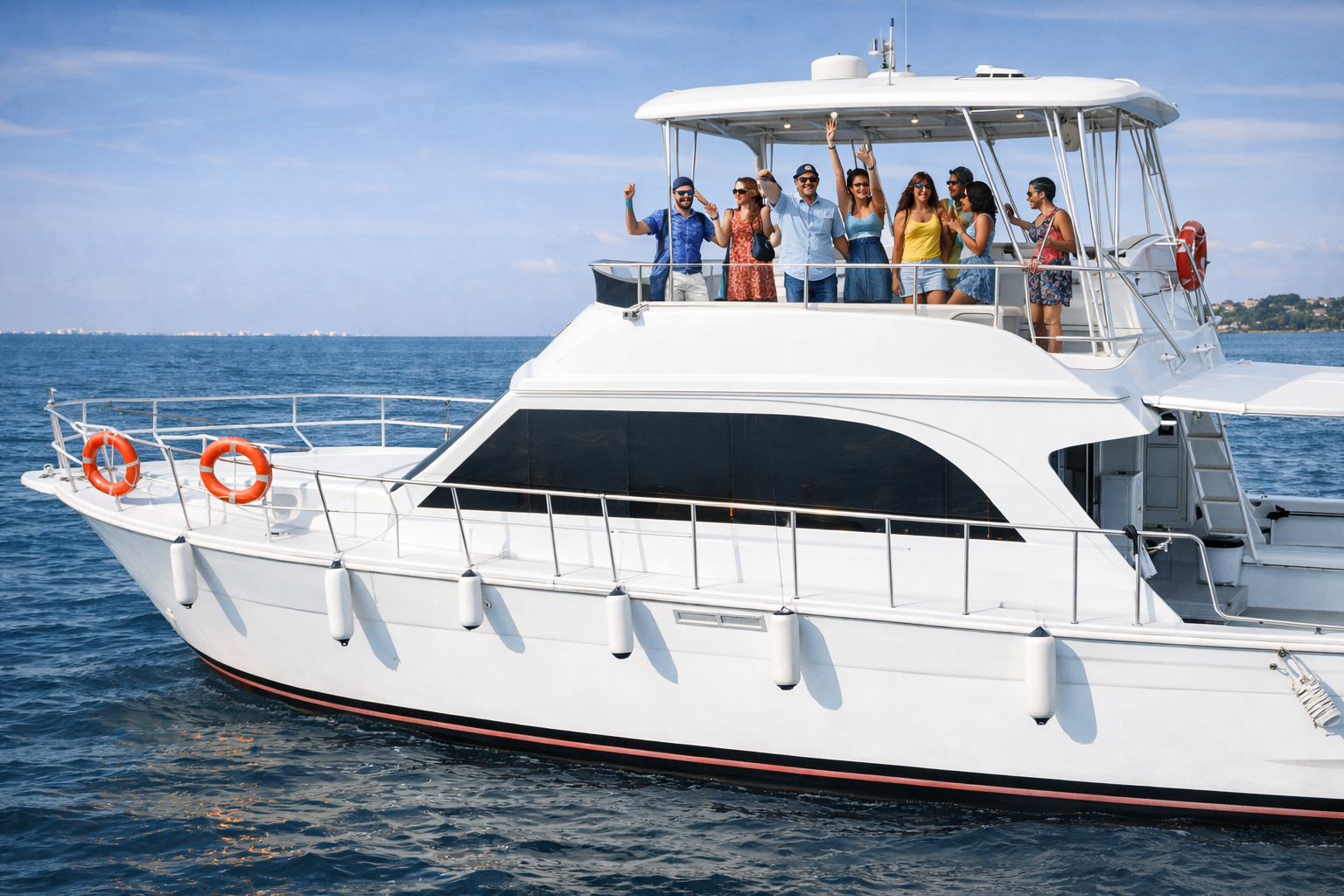Host a fun yacht party with friends while enjoying music, drinks, and skyline views.